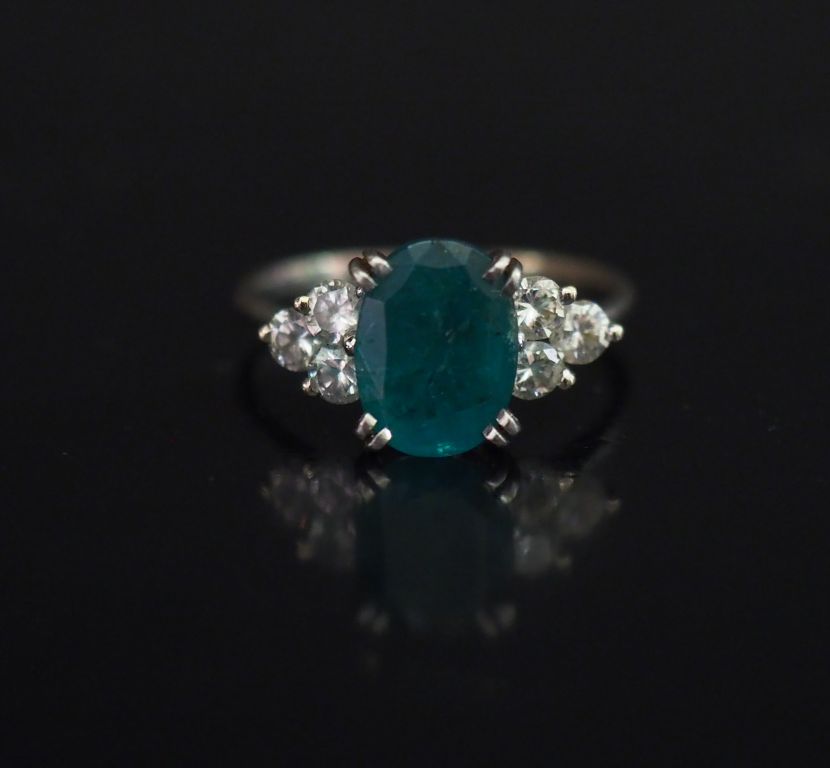 Bague en or blanc, émeraude épaulée de six diamants. Poids : 3,10 g