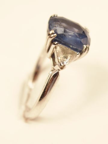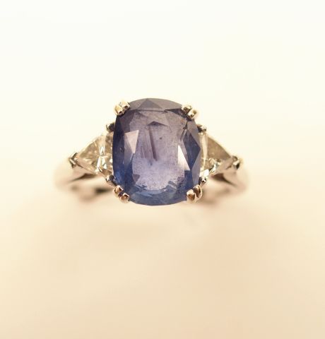 Bague en or blanc, ornée d'un saphir de Ceylan naturel (3,30 ct environ) de taille coussin, épaulé de deux diamants troïda (0,15 ct x 2 environ). TDD : 52 Poids tel : 4,38 gr