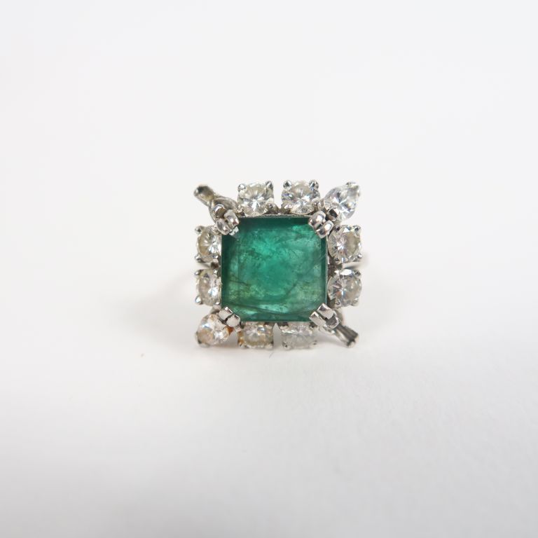 Bague en or blanc ornée d'une émeraude entourée de diamants. TDD. 55 gr Poids tel. 7,12 g (manque deux petits diamants)