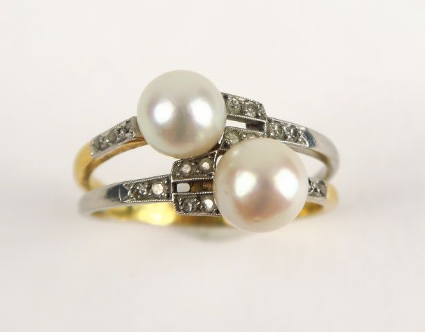 Bague en or et platine ornée de deux perles et de petites roses. Poids tel : 4,8 g