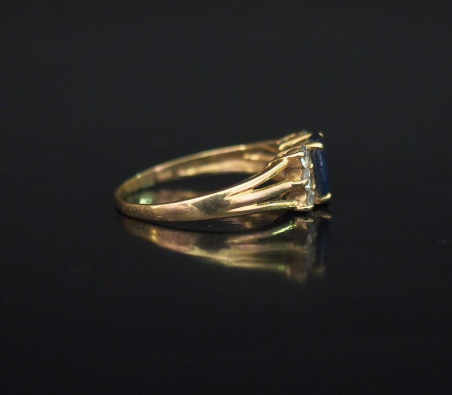 Bague en or jaune 14k, sertie en son centre d'une pierre bleue épaulée de six petits diamants. Jolie monture ajourée. TDD. 56 1/2 Poids tel. 2,81 g (anneau légèrement tordu)