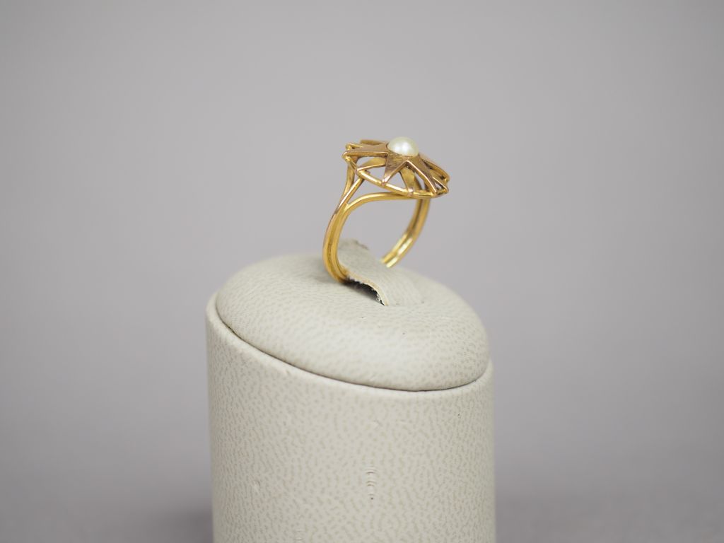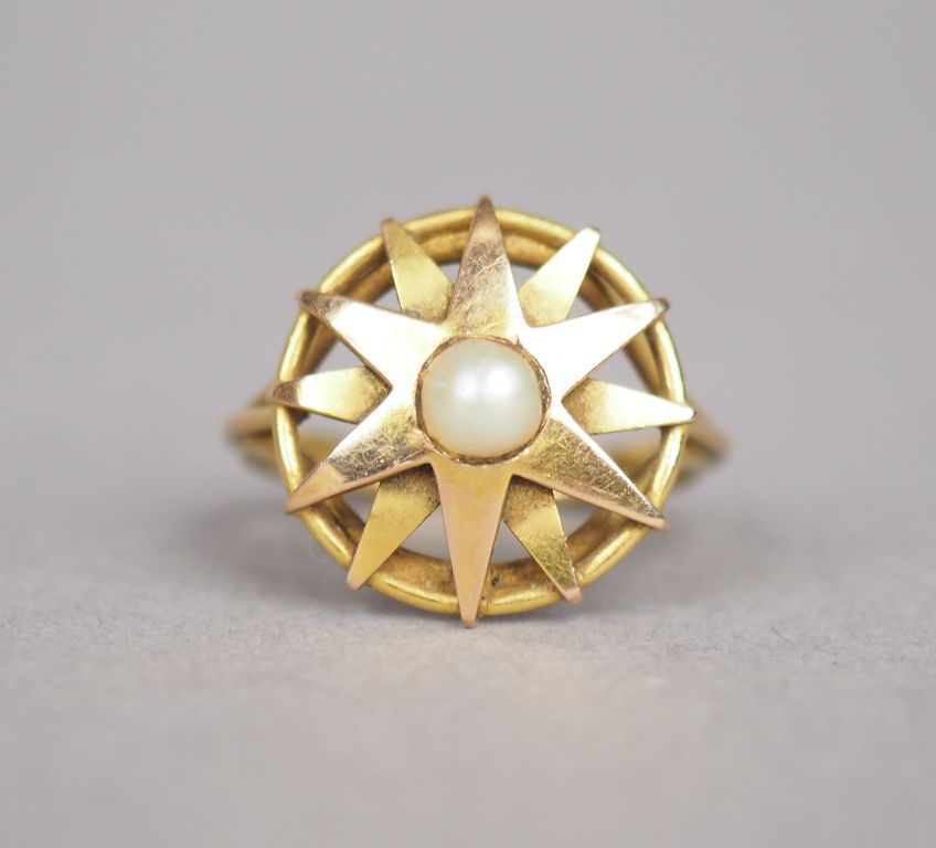 Bague en or jaune, à décor d'étoiles et d'une perle en son centre. TDD. 50 Poids tel. 3,87 g