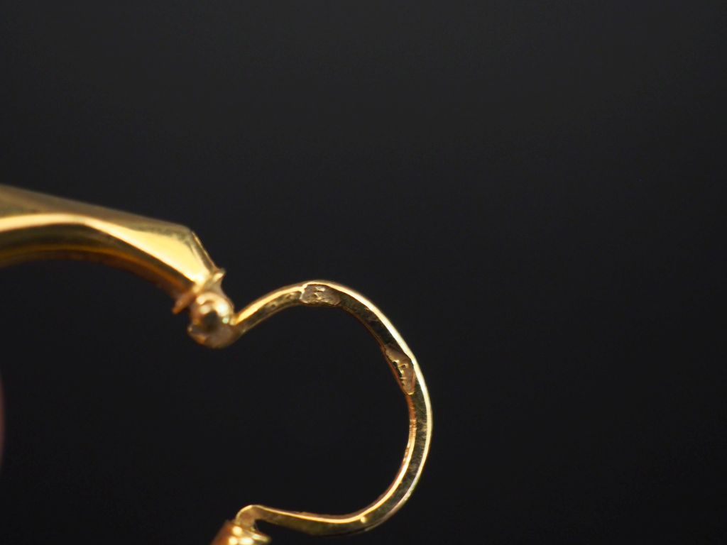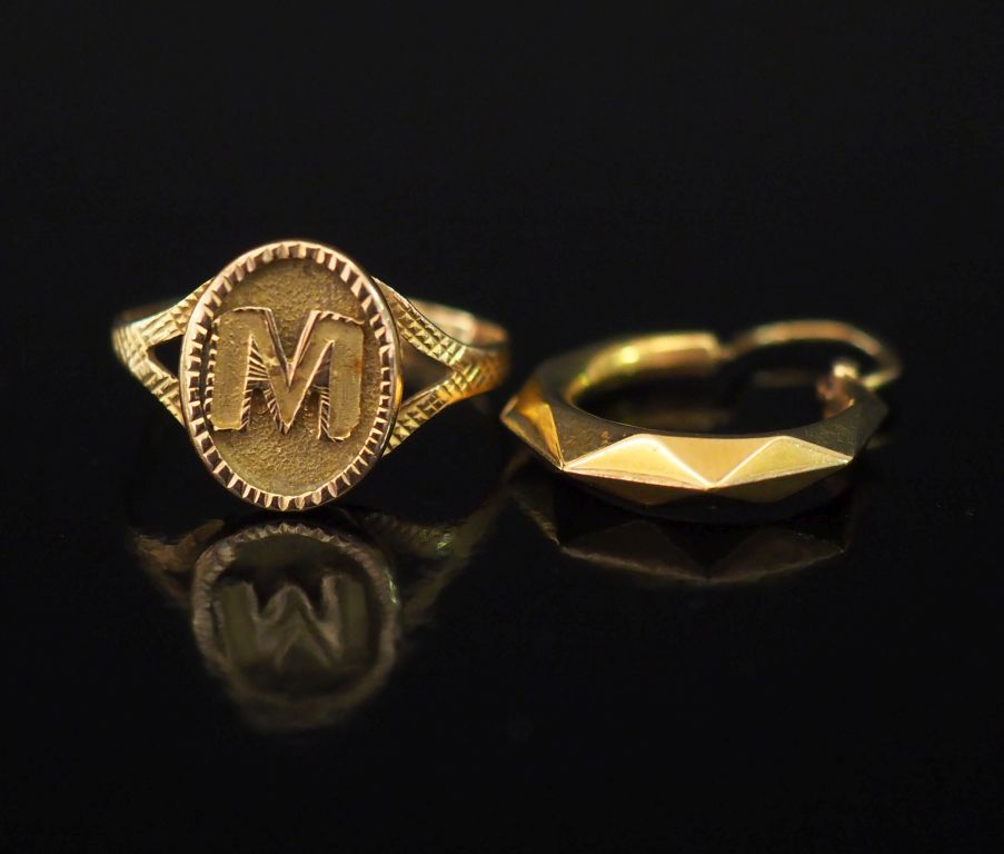 Bague en or jaune, à décor en son centre de la lettre "M" en médaillon. TDD. 51 On y joint une créole en or jaune, de fore gémétrique. Poids. 2,88 g