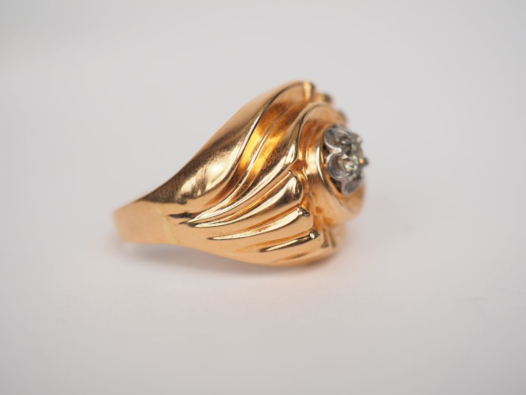 Bague en or jaune en forme de tourbillon, sertie en son centre d'un petit diamant taille ancienne de 0,20 ct environ. TDD. 54 1/2 Poids tel. 3,96 g
