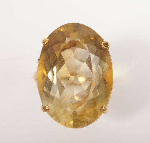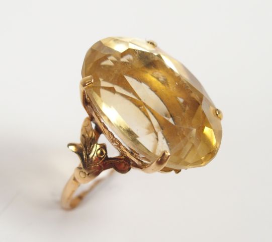 Bague en or jaune, monture travaillée décor de feuille d'acanthe, ornée d'une topaze jaune taille ovale de 22ct environ. TDD 52 Poids tel: 6,2gr