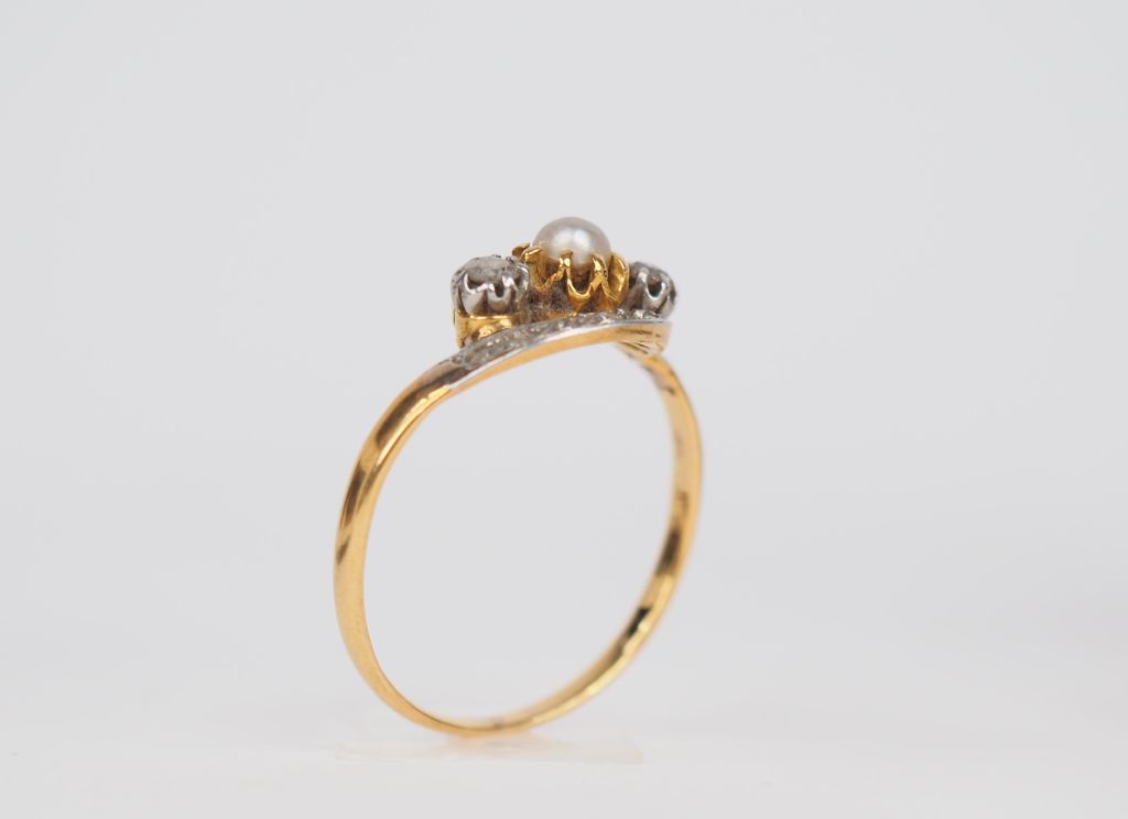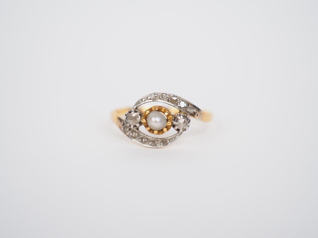 Bague en or jaune, ornée en son centre d'une perle entourée de petits diamants. TDD. 56 Poids tel. 1,94 g