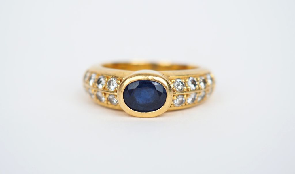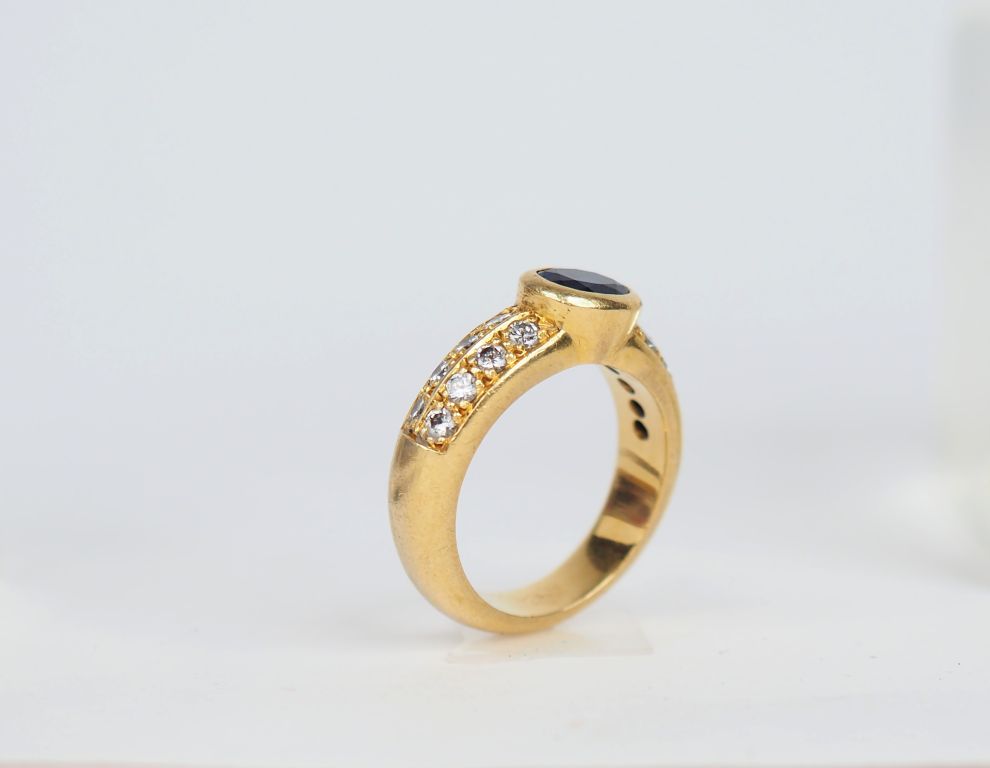 Bague en or jaune sertie en son centre d'un saphir épaulé de part et d'autre de deux lignes de quatre petits diamants. TDD. 52 Poids tel. 7,62 g