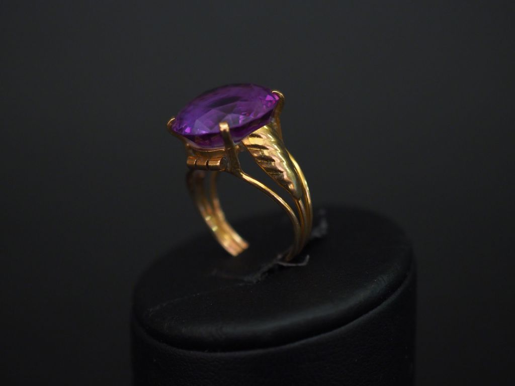 Bague en or jaune, sertie en son centre d’une améthyste. Jolie monture ajourée. TDD. 52 Poids tel. 6,35 g