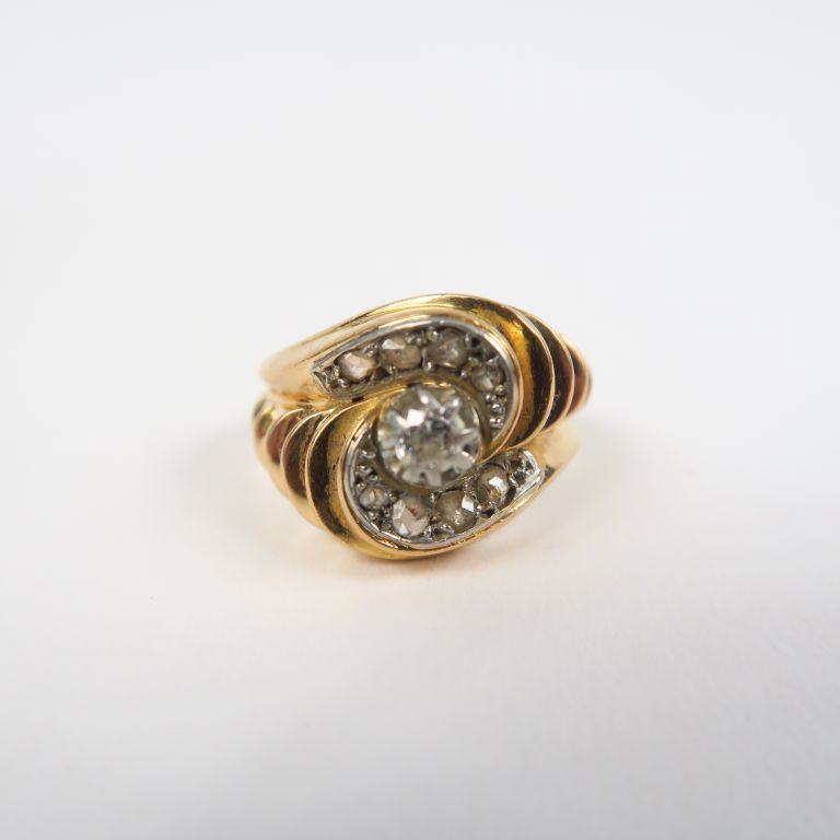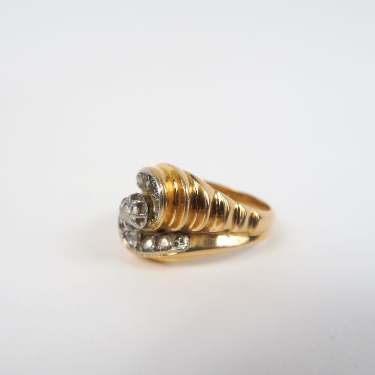 Bague en or jaune torsadée, diamant central entouré de roses. Poids : 10 g (manques)