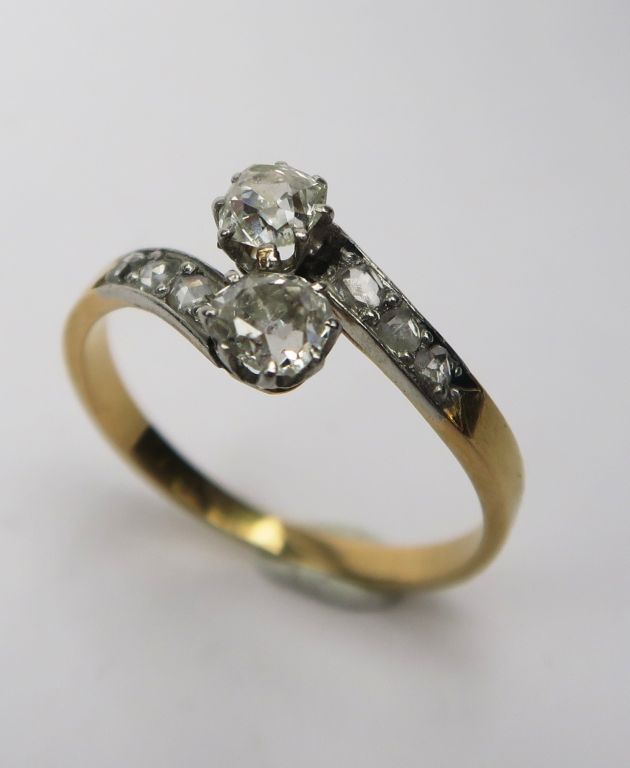 Bague en or ornée de deux diamants taille ancienne de 0,20 carats environ, et de diamants taillés en rose. TDD. 56 Poids tel : 2,5 g
