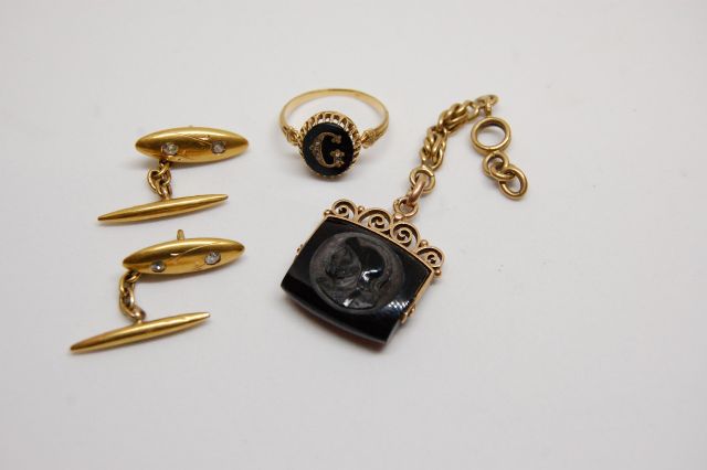 Bague en or, ornée d'une pierre monogrammée et rehaussée de roses, une intaille sur son support avec une partie de chaine, et une paire de boutons de manchettes en or sertis de petites roses. Poids tel : 16,35 g