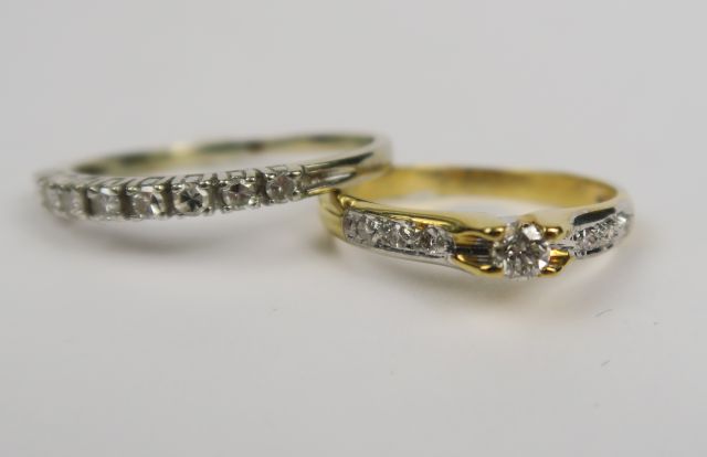 Bague en or, sertie d'un brillant et de petites roses. On y joint une demi-alliance ornée de pierres à l'imitation du diamant. Poids tel : 4,4 g