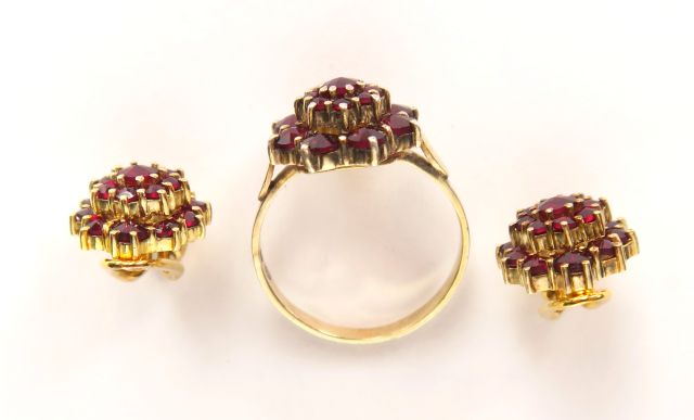 Bague et paire de clips d'oreilles assortis ornés de grenats, les montures en vermeil. Poids tel : 7,30 g