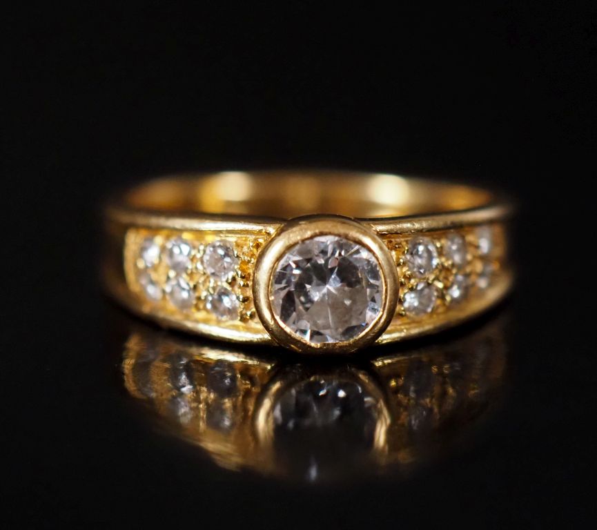 Bague jonc en or 750, diamant central de taille ancienne entouré de deux lignes de six brillants Poids : 3,80 g