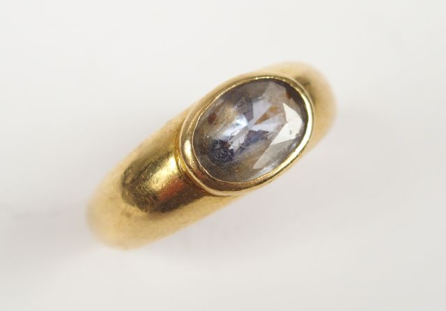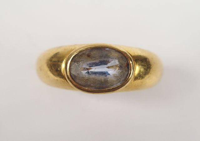 Bague jonc en or jaune sertie en son centre d'un saphir taille ovale (traitements). TDD 60 Poids tel: 7,1gr