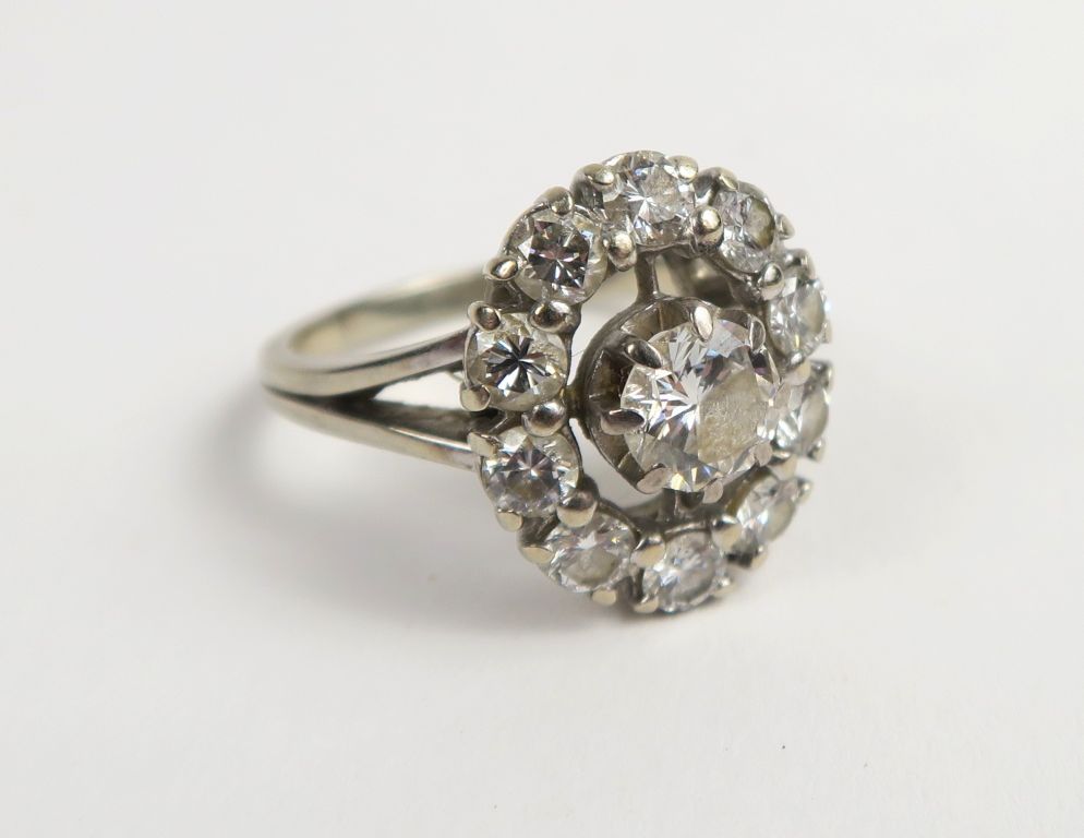 Bague marguerite en or blanc, ornée d'un brillant central dans un entourage de brillants