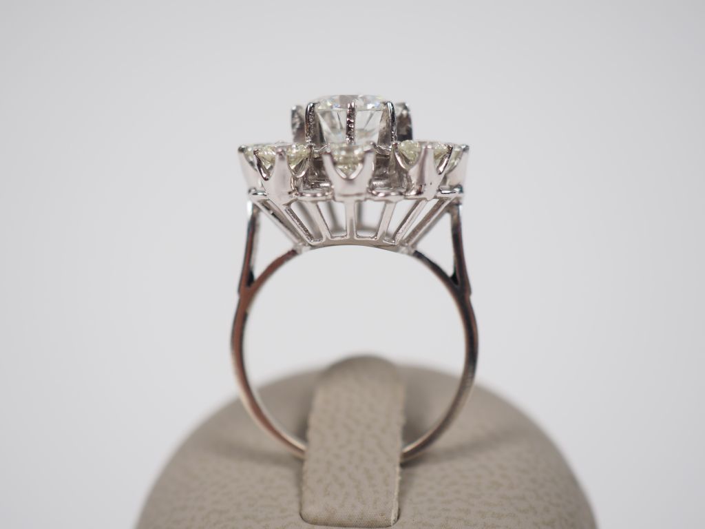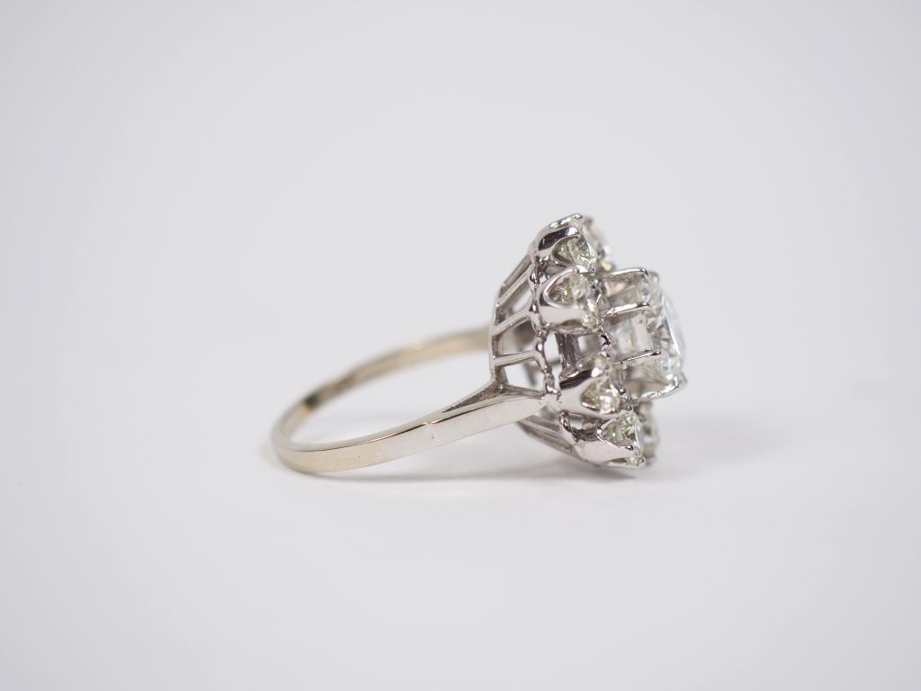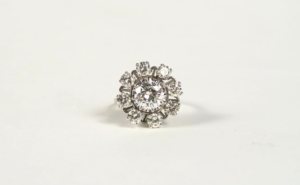Bague marguerite en or blanc, sertie d'un diamant central taille brillant de 2 ct G-SI2, entouré de huit diamants de 0,20 ct environ. TDD. 57 Poids tel. 7,29 g Rapport du Laboratoire Français de Gemmologie en date du 21 Janvier 2020.