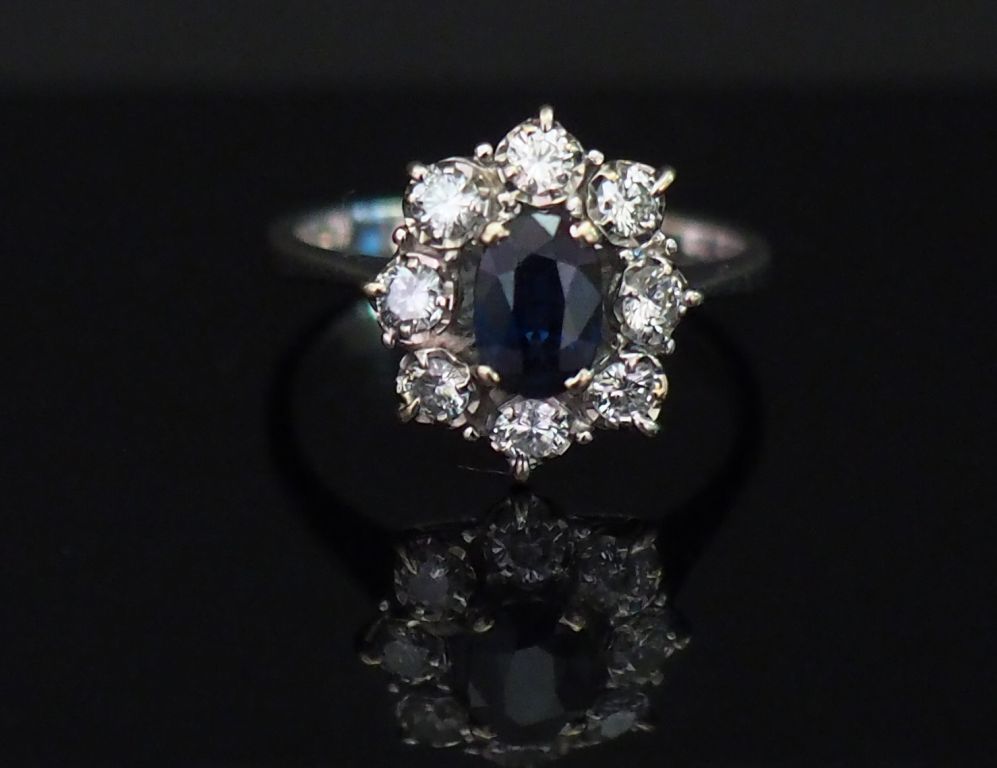 Bague marguerite en or blanc, sertie en son centre d’un saphir entouré de huit diamants. TDD. 53 Poids tel. 3,55 g