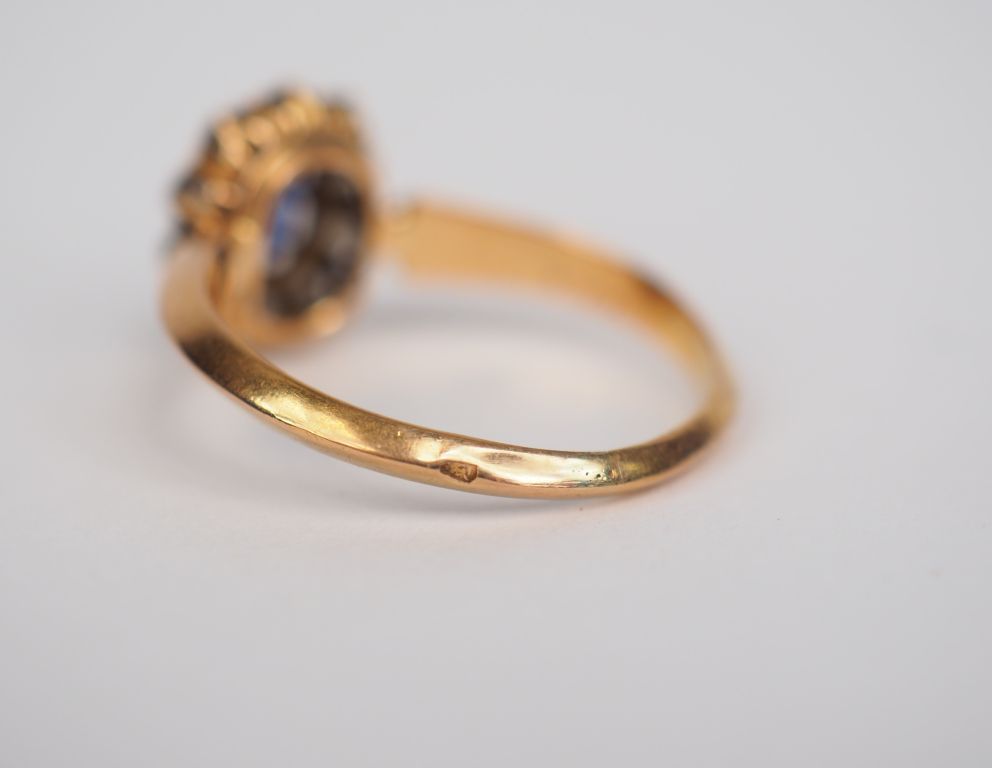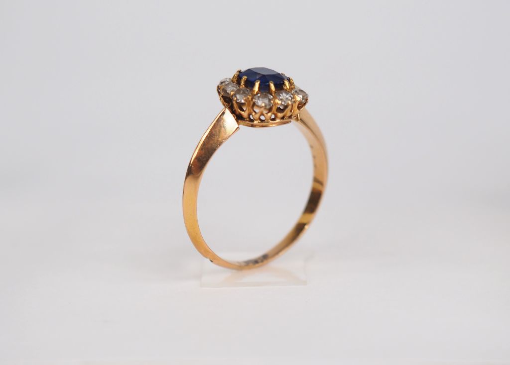 Bague marguerite en or jaune, ornée en son centre d'un saphir entouré de diamants. TDD. 53 Poids tel. 2,50 g