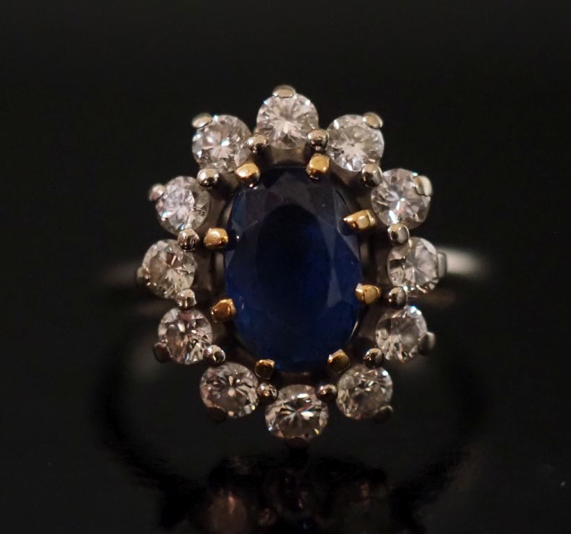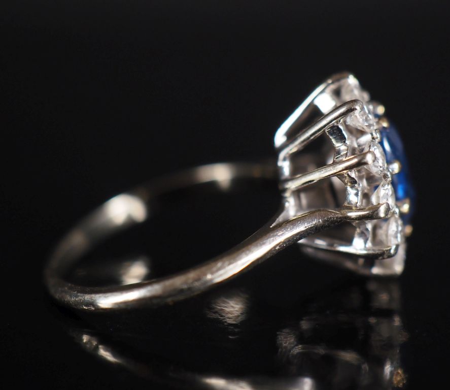 Bague marguerite, saphir entouré de 11 diamants, monture en or blanc 750 Poids : 4,90 g