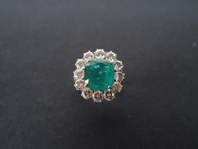 Bague marguerite sertie d'une émeraude 12 x 11,5 et entourage de brillants pour 2,40 cts environ.