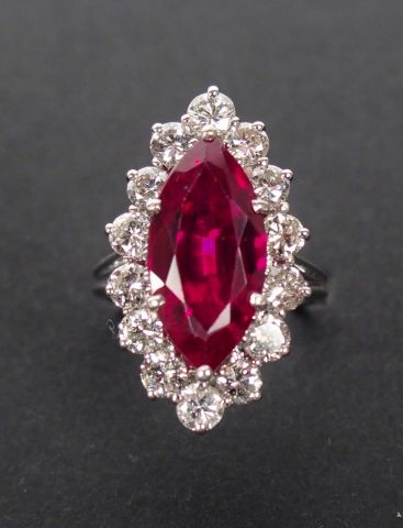 Bague marquise monture or blanc, ornée en son centre d'un rubis synthétique de 4cts environ, entourage de brillants de 0,20cts environ. TDD 56 Poids tel: 9,6gr