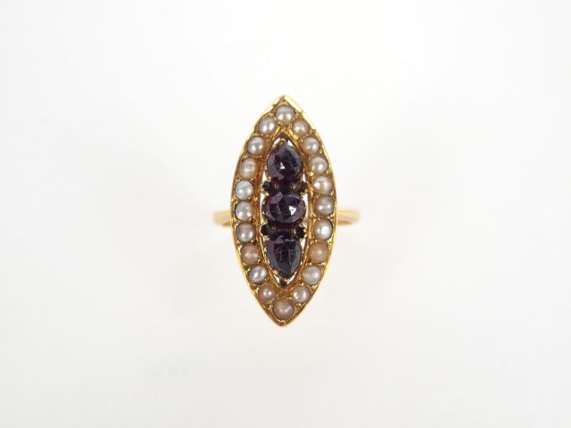 Bague marquise monture or jaune, ornée de 3 grenats entourage de perles. TDD 56 Poids tel: 7,4gr