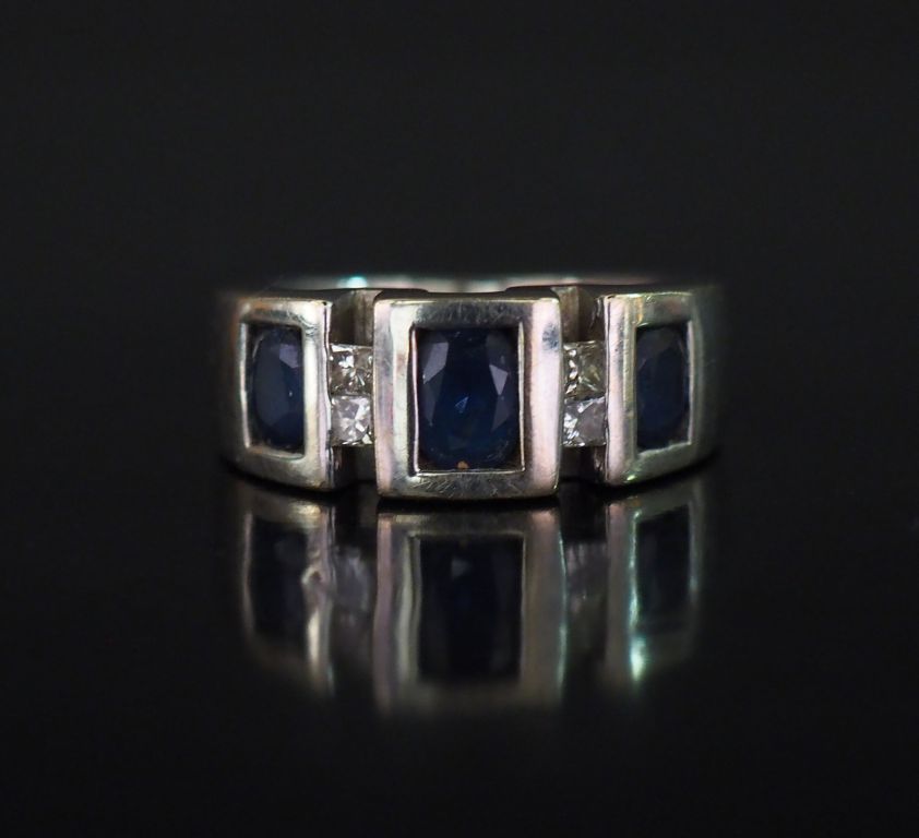 Bague moderne en or blanc, sertie de trois saphirs et quatre petits diamants alternés. TDD. 53 Poids tel. 17,53 g