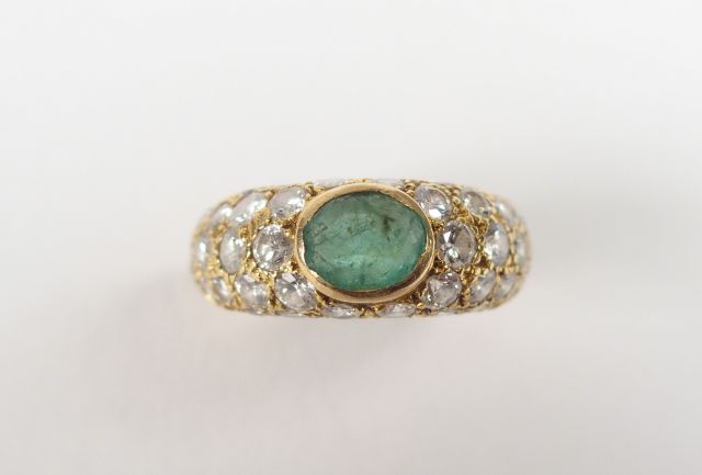 Bague moderne monture or jaune, sertie en son centre d'une émeraude et pavage de diamants taille moderne. TDD 48 Poids tel: 3,9gr