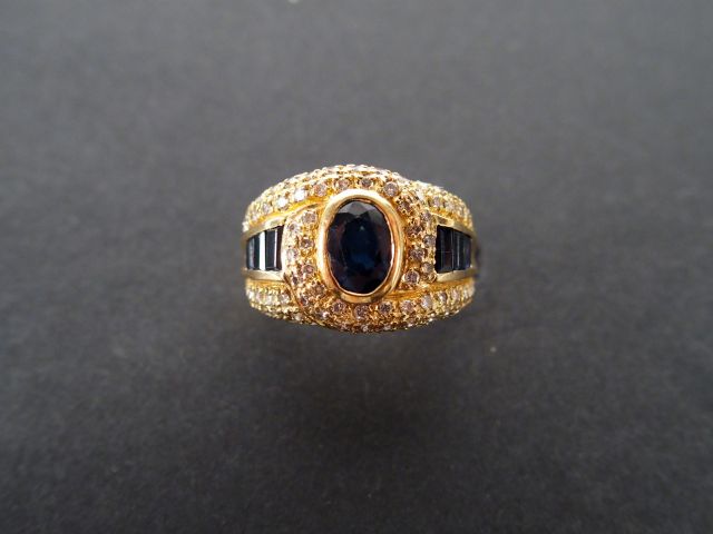 Bague monture moderne or jaune, serti d'un saphir de 1cts environ épaulés de 6 saphirs taille baguette disposés en chute et pavage de brillants. TDD 53 Poids tel: 10,2gr