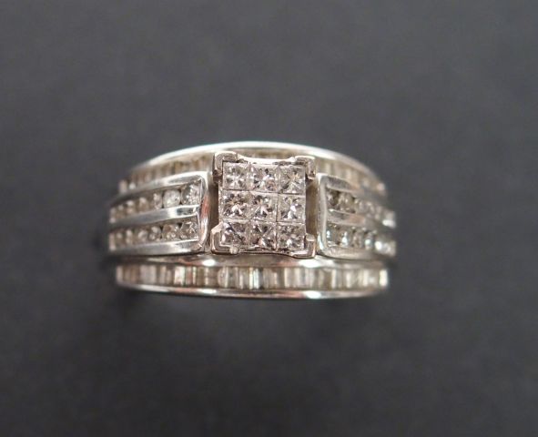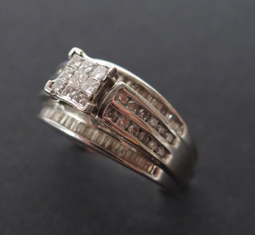 Bague monture or blanc 9K, rehaussée en son centre d'un motif carré pavé de brillants entre 4 lignes de brillants, l'ensemble souligné de 2 lignes de diamants taille baguette. TDD 54 Poids tel: 6,4gr