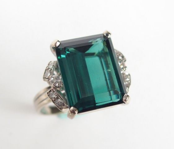 Bague monture or blanc travaillée, ornée d’une gahnite (spinelle) rectangulaire de 8,8ct environ, épaulé de 2 motifs Art déco en diamants taille moderne. TDD 56 Poids tel : 6,1gr