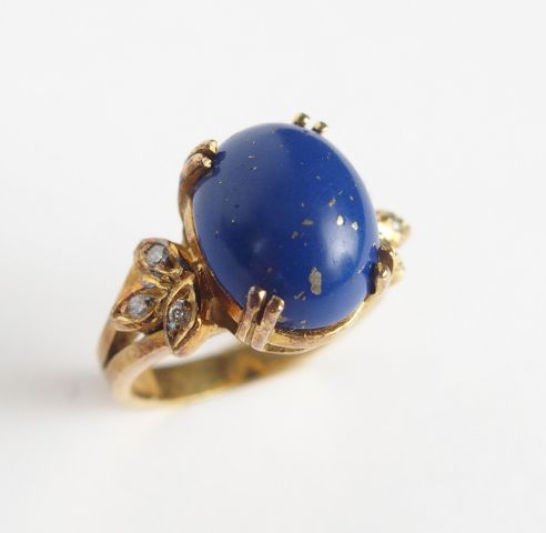 Bague monture or jaune ornée d'un cabochon en lapus lazzuli, épaulé de 2 feuillages en brillants. TDD 48. Poids tel: 7gr
