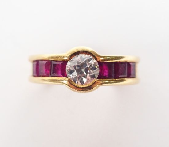 Bague monture or jaune ornée d'un diamant taille ancienne de 0,52ct environ dans un demi serti épaulé de 6 rubis calibrés. TDD 50 Poids tel: 6,4gr