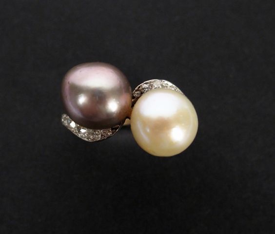 Bague monture or jaune, Vous et Moi de perles baroques blanche et grise, épaulées de diamants taille ancienne disposés en chute. TDD 50 Poids tel: 7gr
