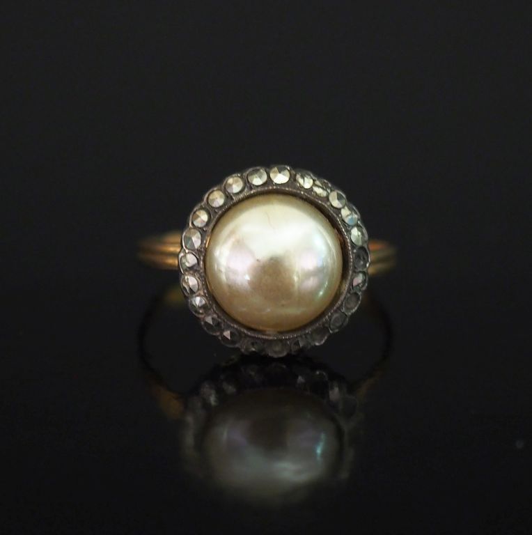 Bague Napoléon III en or jaune 750, sertie en son centre d'une demi perle blanche entourée d'une couronne de petites pierres fantaisie. TDD. 59 Poids tel. 2,65 g (petits manques)