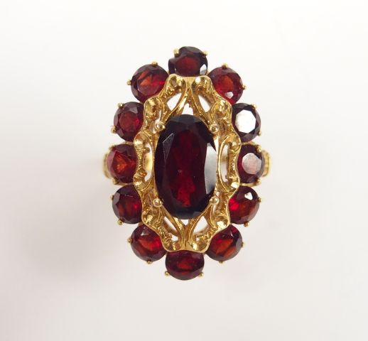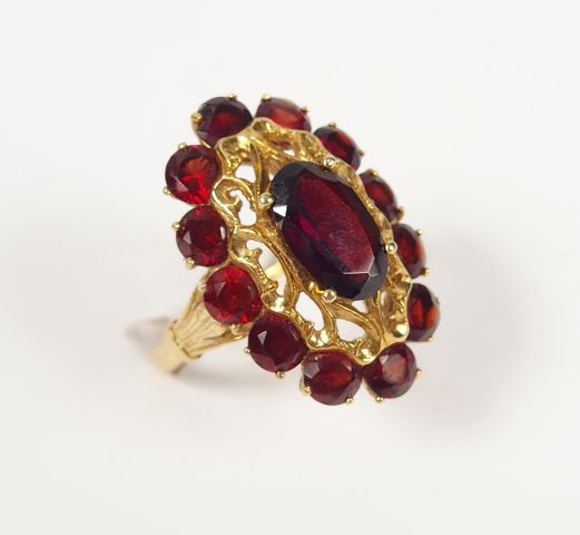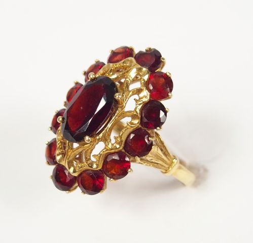Bague Napoléon III en or jaune, ornée en son centre d'un grenat taille ovale entouré de 12 grenats taille brillant. TDD 57,5 Poids tel: 6,4gr