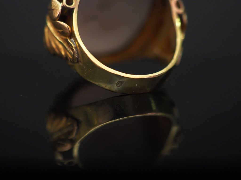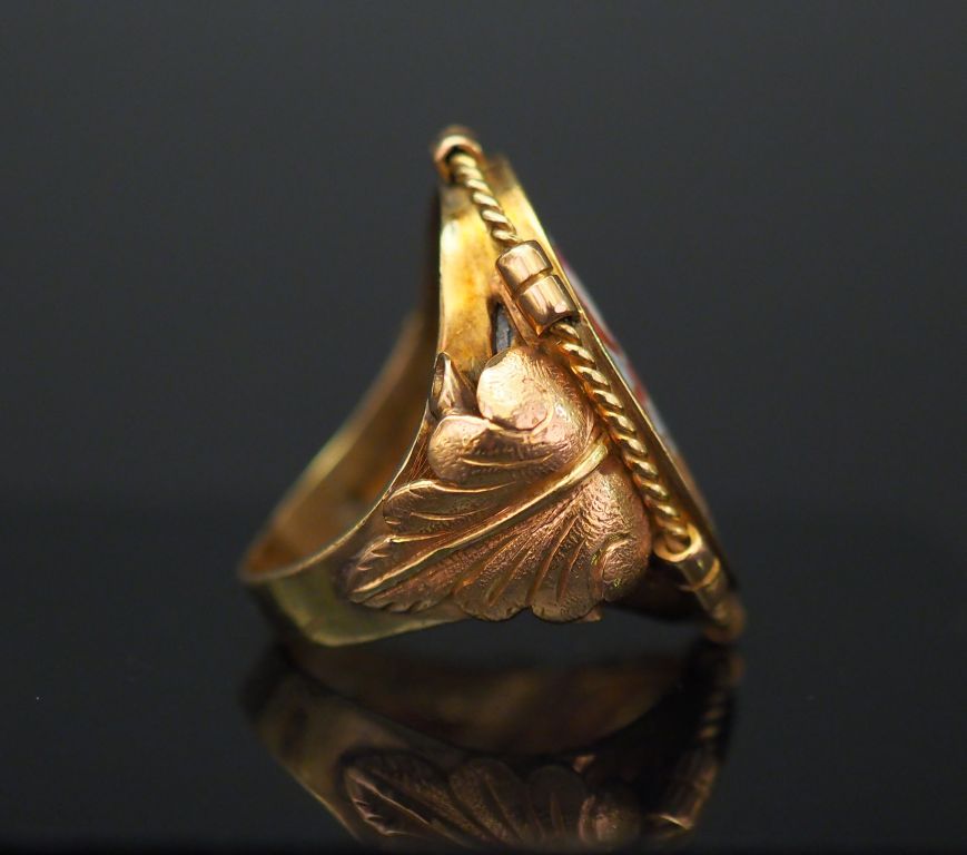 Bague Napoléon III en or jaune, sertie en son centre d'une plaque en porcelaine, à décor polychrome. Monture, à décor de feuille d'acanthe. TDD. 57 Poids tel. 12,25 g