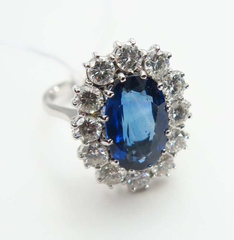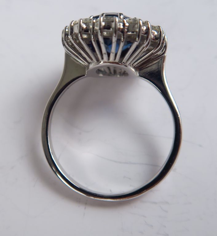 Bague ornée d'un saphir ovale de 4 carats environ, dans un entourage de 12 brillants. Monture en or blanc. Poids tel : 6,5 g ac