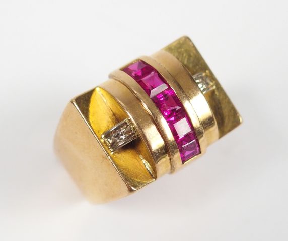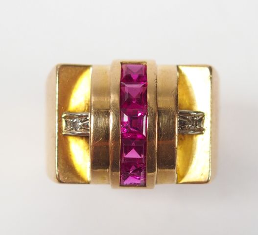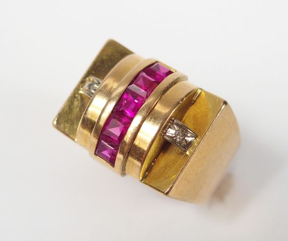 Bague "pont" en or jaune, rehaussée d'une ligne de rubis synthétiques calibrés. TDD 55 Poids tel: 10,7gr