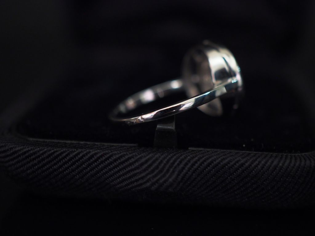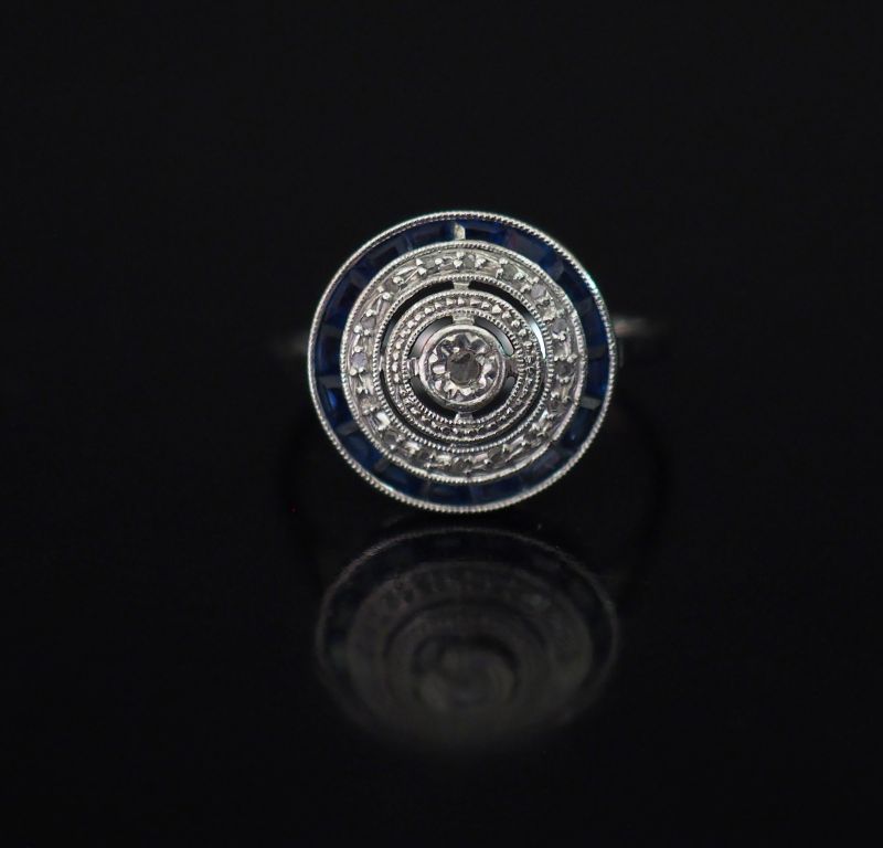 Bague ronde en or blanc, sertie en son centre d'un éclat de diamant entouré d'une couronne de petits éclats de diamants et d'une couronne de petits saphirs calibrés. TDD. 51 Poids tel. 2,77 g