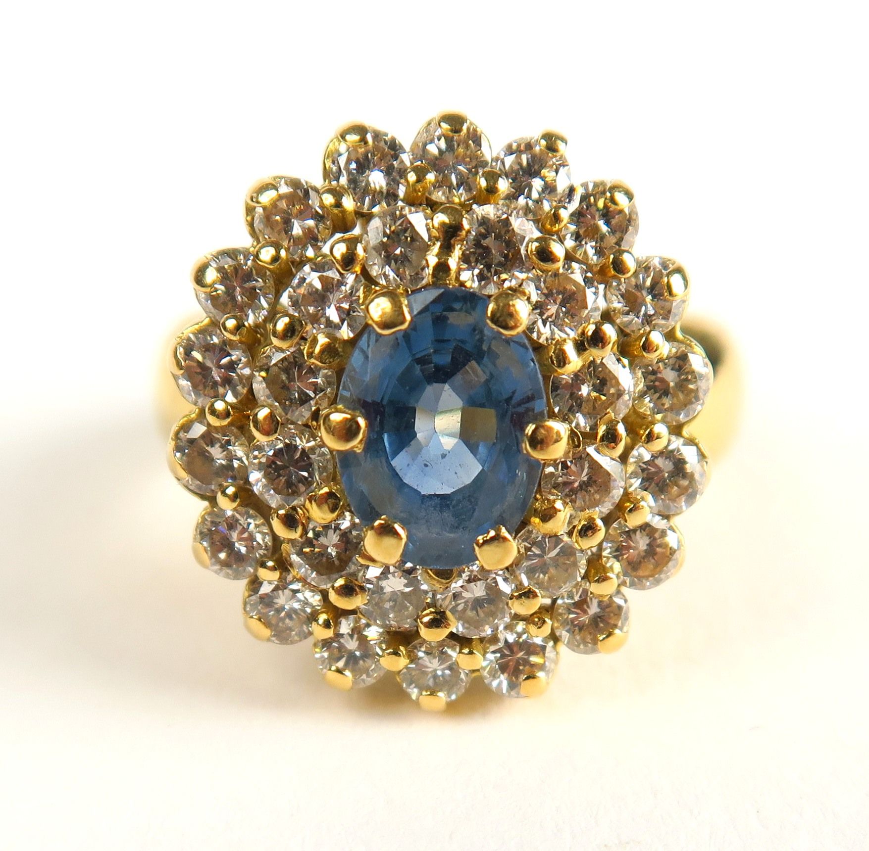 Bague sertie d'un saphir dans un double entourage de brillants. Monture en or jaune.