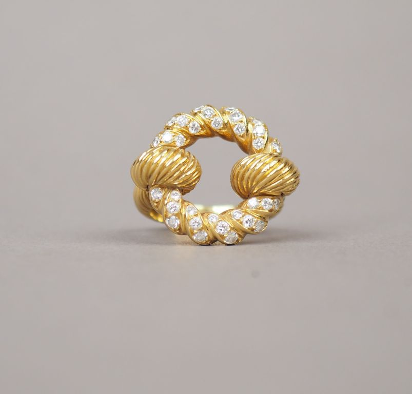 Bague torsadée en or jaune, ornée de trente-deux petits diamants. TDD. 58 Poids tel. 18,89 g