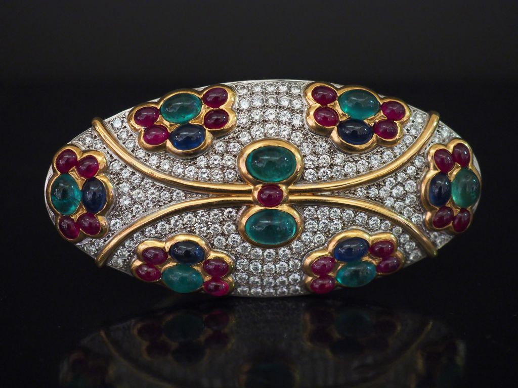 Barrette "Tutti frutti" pour cheveux deux tons d'or, sertie d''un pavage de cent deux diamants agrémenté de huit émeraudes, vingt-cinq rubis et six saphirs en cabochon. 8,8 x 4,5 cm Poids tel : 55,8 g (attache en métal)