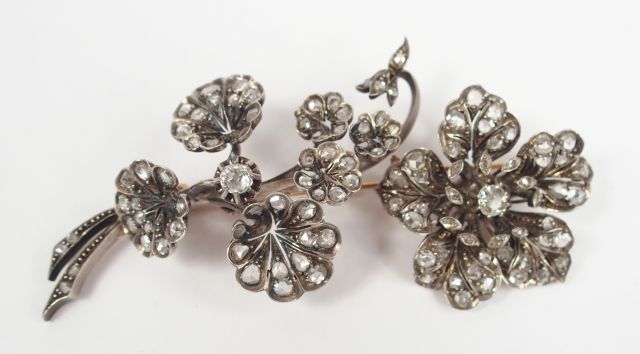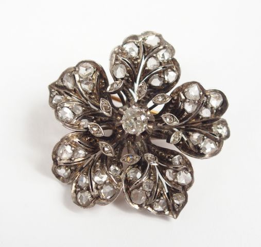 Bijoux à transformation en or blanc composé de 2 broches en forme de branche fleurie et de fleur épanouie, l'ensemble pavé de diamants taille ancienne et taille rose ou anversoise. Circa 1900. J. PERET NEVEU à Clermont-Ferrand. Dans son écrin d'origine. Poids tel: 32,5gr