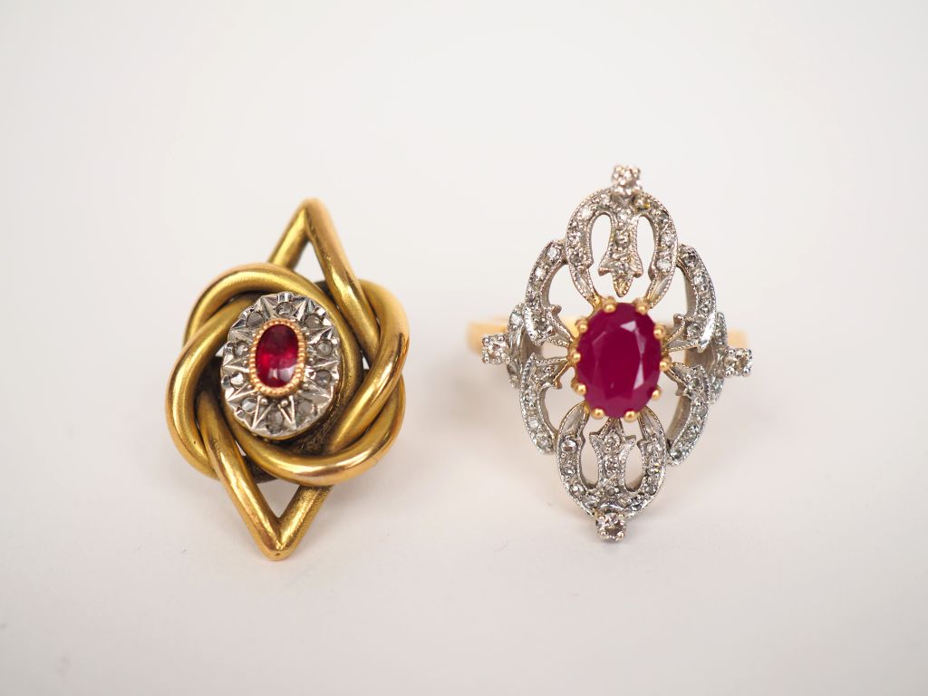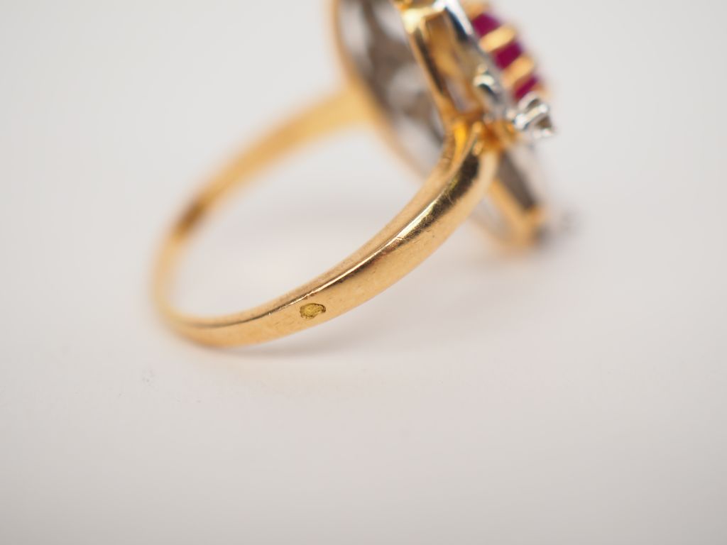 Bouton de manchette en or jaune, orné en son centre d’une marguerite sertie d’une pierre rose et de petits diamants. On y joint une bague ornée de pierres à l’imitation du diamant et d’une pierre rose. Poids tel. 9.03 g