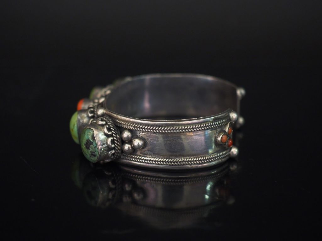 Bracelet Afrique du Nord en argent 925, serti de corail (?) et pierres dures en cabochon. 5 x 6,2 cm Poids tel. 67 g