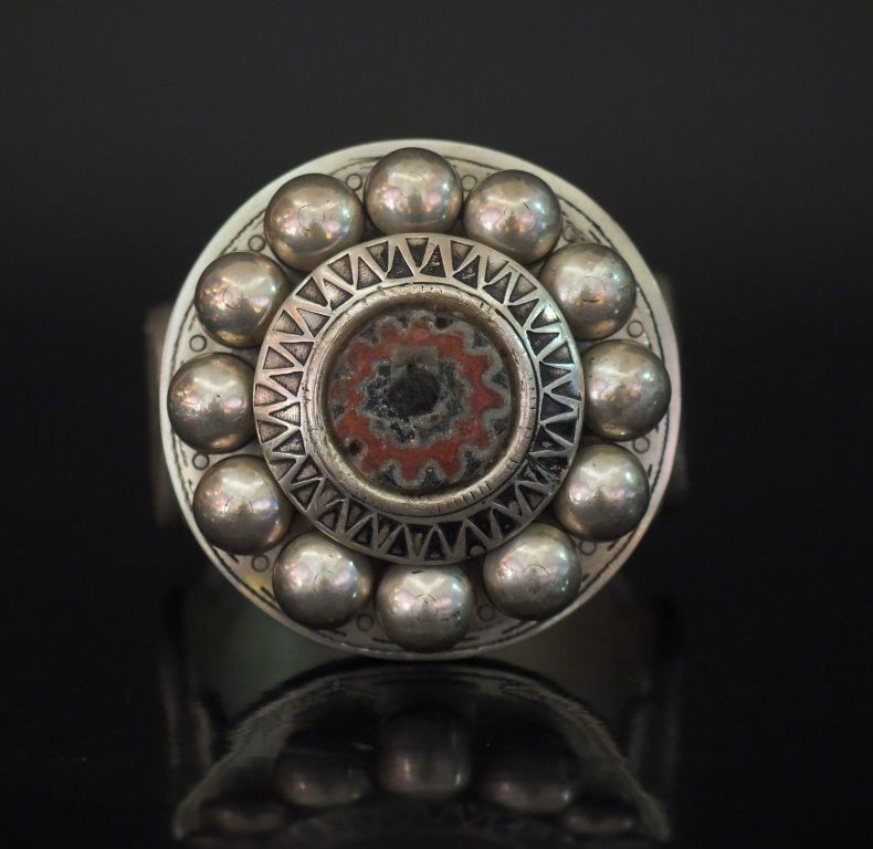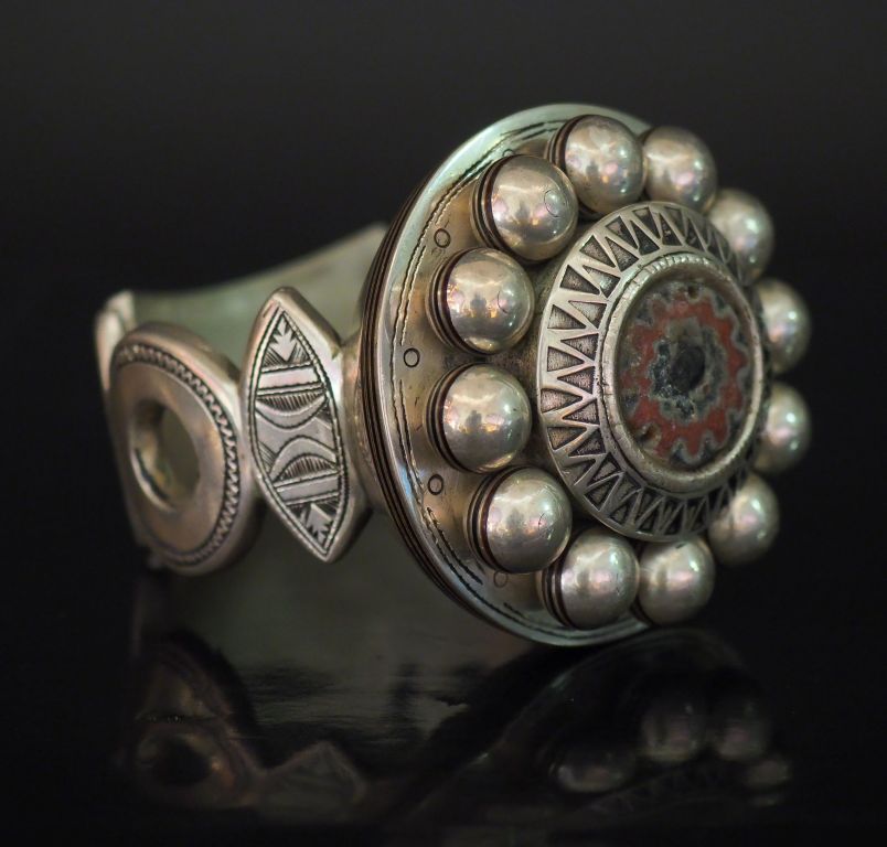 Bracelet Afrique du Nord en argent ajouré, rehaussé d'émail et d'une pierre dure en son centre, à décor de motifs géométriques et de boules. 6,5 x 6,7 cm Poids tel. 268 g (petits accidents)