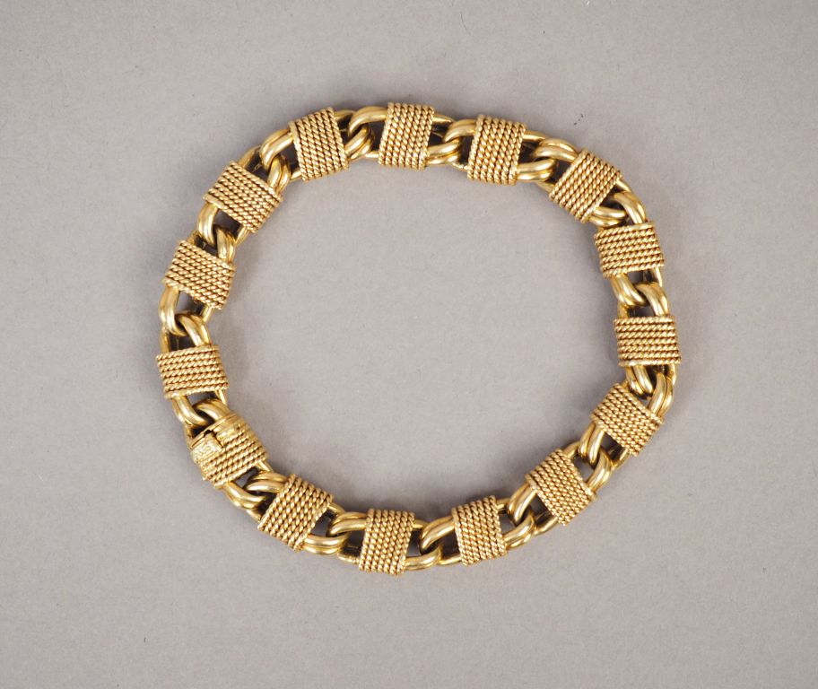 Bracelet articulé en or jaune, maillons ovales double rangs à décor de filets tressés. Long. 21,5 cm Poids. 68,95 g