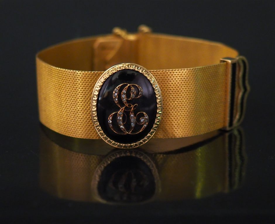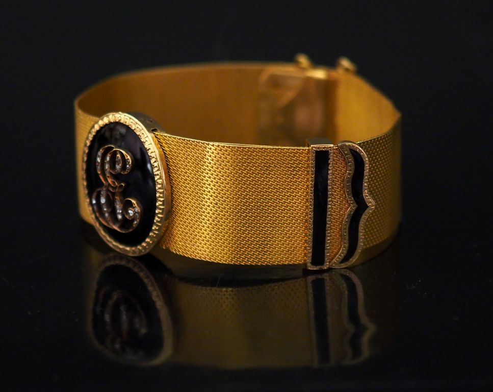 Bracelet ceinture Napoléon III en or jaune, émail noir et petits diamants taillés en rose, à décor d'un médaillon central ovale orné d'un monogramme. Bracelet souple, maille plate. Chainette de sécurité. Poids tel. 39,47 g (petit accroc au bracelet)